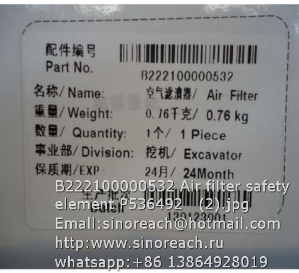 B222100000532 Air filter safety element P536492 for SANY spare parts